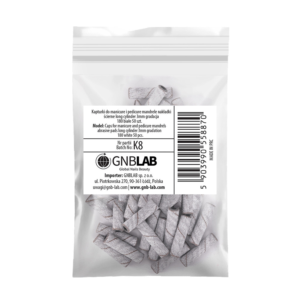 Kapturki ścierne przelotowe na cylinder long o rozmiarze 3 mm. Gradacja #180 jest idealna do opracowania naturalnej płytki, skórek oraz wygładzenia masy żelowej, akrylożelowej i akrylowej.