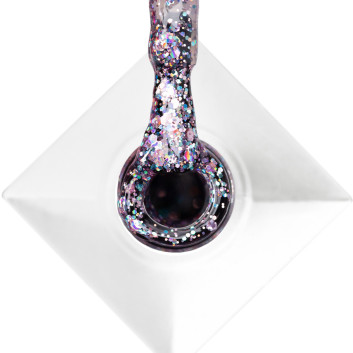 Brokatowy lakier hybrydowy umożliwia uzyskanie intensywnie lśniącego, opalizującego efektu, przypominającego taflę drobno zmielonych kamieni szlachetnych.