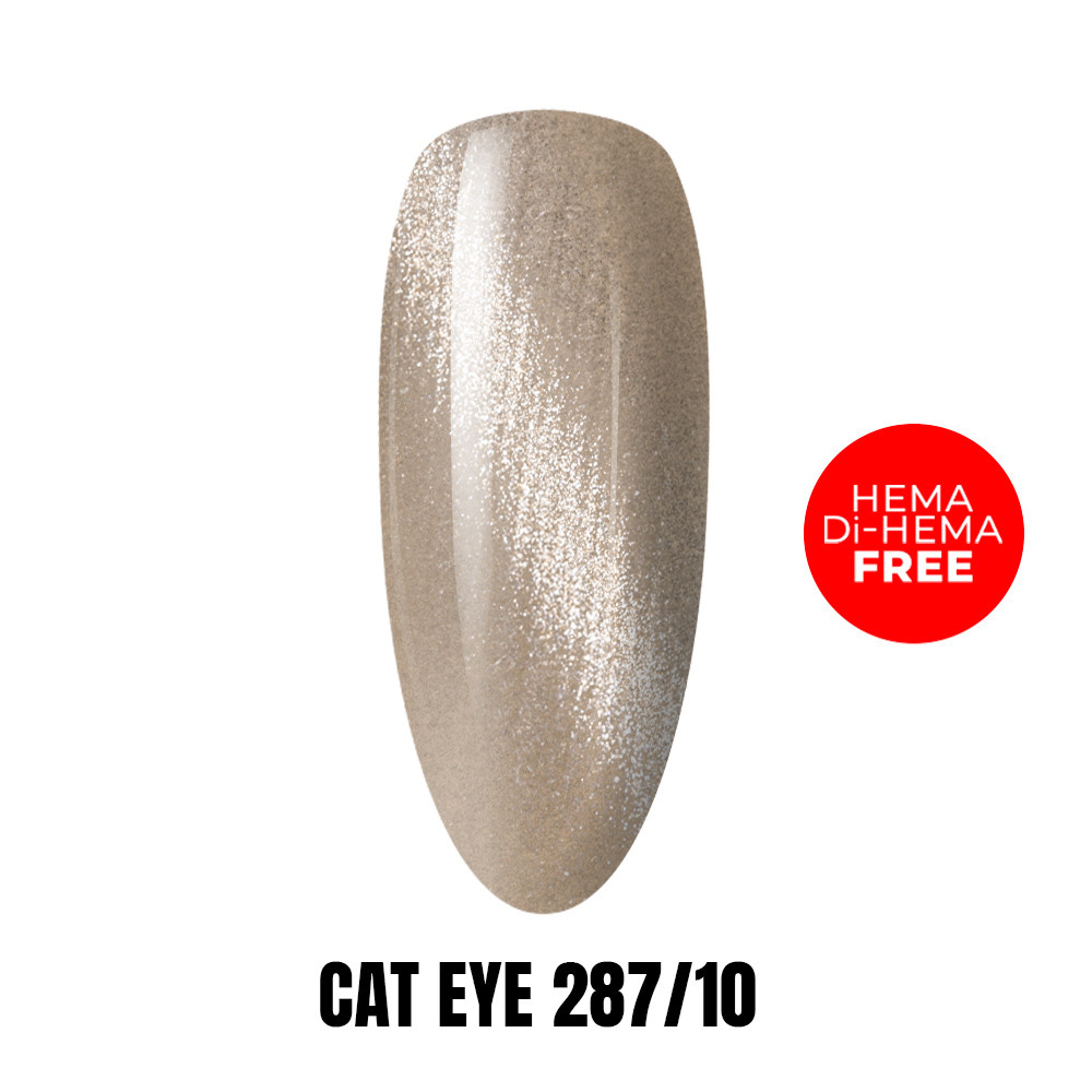 Lakier hybrydowy typu Cat Eye zawiera magnetyczne drobinki, które pod wpływem działania magnesu tworzą charakterystyczny, migoczący wzór przypominający efekt „kociego oka”.