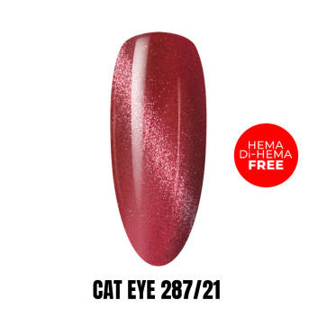 Lakier hybrydowy typu Cat Eye zawiera magnetyczne drobinki, które pod wpływem działania magnesu tworzą charakterystyczny, migoczący wzór przypominający efekt „kociego oka”.
