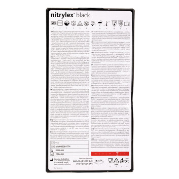 Nitrylex black to nitrylowe rękawice diagnostyczne, ochronne, niejałowe. Teksturowane na końcach palców, bezpudrowe. Powierzchnia wewnętrzna chlorowana. Mankiet rolowany.