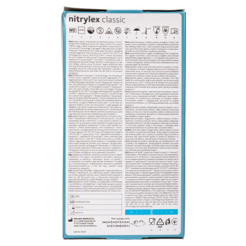 Nitrylex classic to nitrylowe rękawice diagnostyczne, ochronne, niejałowe. Teksturowane na końcach palców, bezpudrowe. Powierzchnia wewnętrzna chlorowana. Mankiet rolowany.