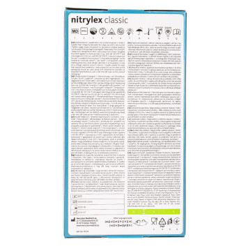 Nitrylex classic to nitrylowe rękawice diagnostyczne, ochronne, niejałowe. Teksturowane na końcach palców, bezpudrowe. Powierzchnia wewnętrzna chlorowana. Mankiet rolowany.