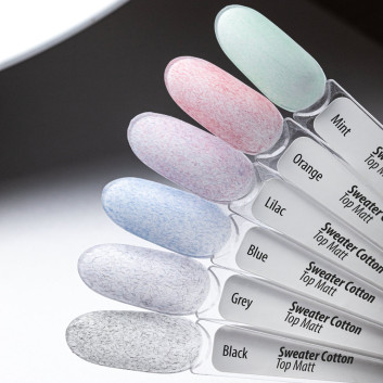 Top matujący z drobinami, dający efekt typu "sweterek" w pastelowej wersji.
