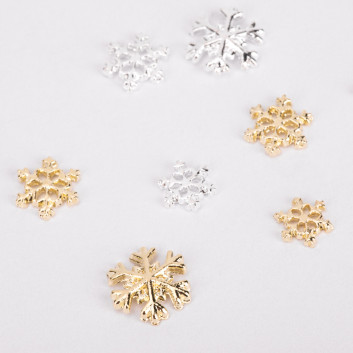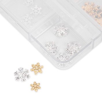 Metalowe, biżuteryjne ozdoby do paznokci w kształcie płatków śniegu. Opakowanie zawiera śnieżynki w dwóch kolorach: srebrnym oraz złotych po 3 rozmiary z każdego koloru, dzięki czemu możesz dopasować ozdoby do każdej płytki paznokcia. Ozdoby będą idealnym uzupełnieniem świątecznych i zimowych stylizacji!