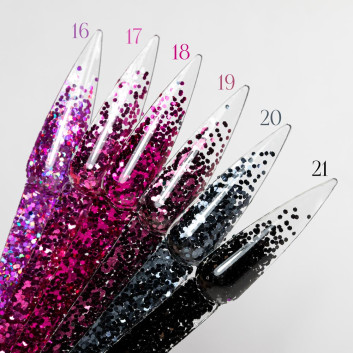 Drobiny można zatapiać pod warstwą żelu, akrylu lub bazie  – tworząc efekt delikatnych „piegi” lub pełnej, błyszczącej tafli. Każdy numer (1–21) to inna kombinacja kolorów i odcieni, dzięki czemu z łatwością dopasujesz ozdobę do swojego stylu.