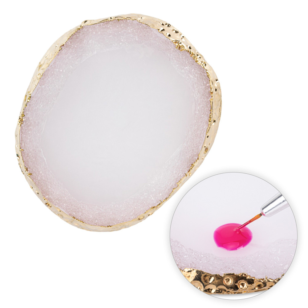 Wykonana z żywicy podkładka sprawdzi się jako paletka do mieszania lakierów hybrydowych i żeli. Dzięki imitującemu kamień design’owi oraz złotym brzegom, stanowić będzie również piękne tło do zdjęć Twoich stylizacji. Możesz ją również wykorzystać jako ozdobę w mieszkaniu.