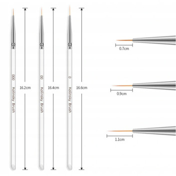 Pędzelki przeznaczone do manicure, pedicure oraz zdobnictwa. Wysokiej jakości włosie sprzyja precyzji wykonania. Duża różnorodność pozwala dobrać odpowiednie narzędzie do każdego zadania od budowy paznokci po kreowanie wszelkiego rodzaju niewielkich detali i wykończeń.