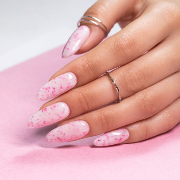 Flakes Rubber Base MollyLac to produkt 2w1 czyli elastyczna baza o mlecznym kolorze wzbogacona różowo-metalicznymi kawałkami folii.