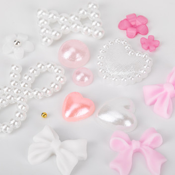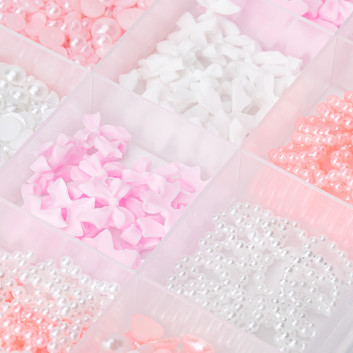 - Zestaw bogaty w różne kształty: perełki, cyrkonie, kokardki, serca, kwiaty, bulion i inne (w zależności od wariantu).