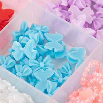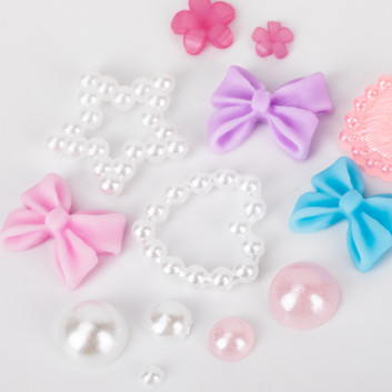 - Zestaw bogaty w różne kształty: perełki, cyrkonie, kokardki, serca, kwiaty, bulion i inne (w zależności od wariantu).