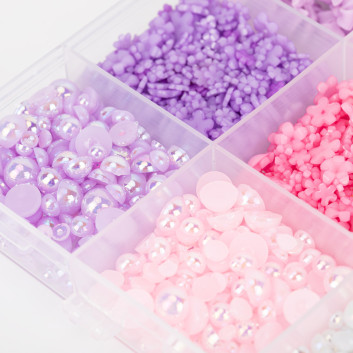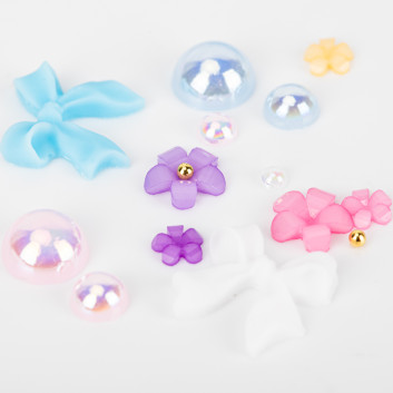 - Zestaw bogaty w różne kształty: perełki, cyrkonie, kokardki, serca, kwiaty, bulion i inne (w zależności od wariantu).