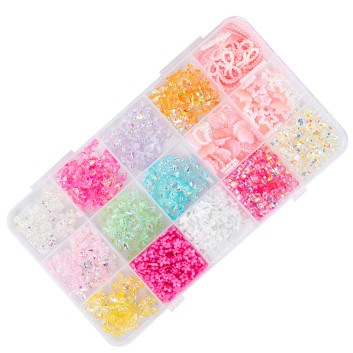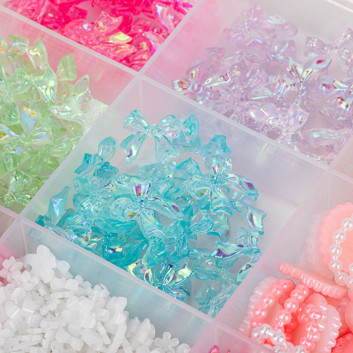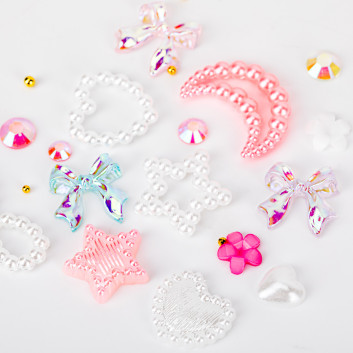 - Zestaw bogaty w różne kształty: perełki, cyrkonie, kokardki, serca, kwiaty, bulion i inne (w zależności od wariantu).
