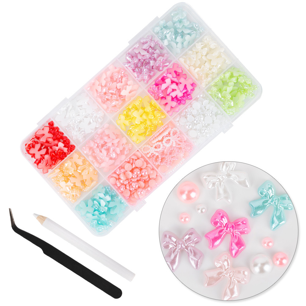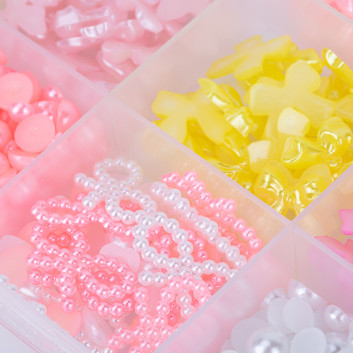 - Zestaw bogaty w różne kształty: perełki, cyrkonie, kokardki, serca, kwiaty, bulion i inne (w zależności od wariantu).