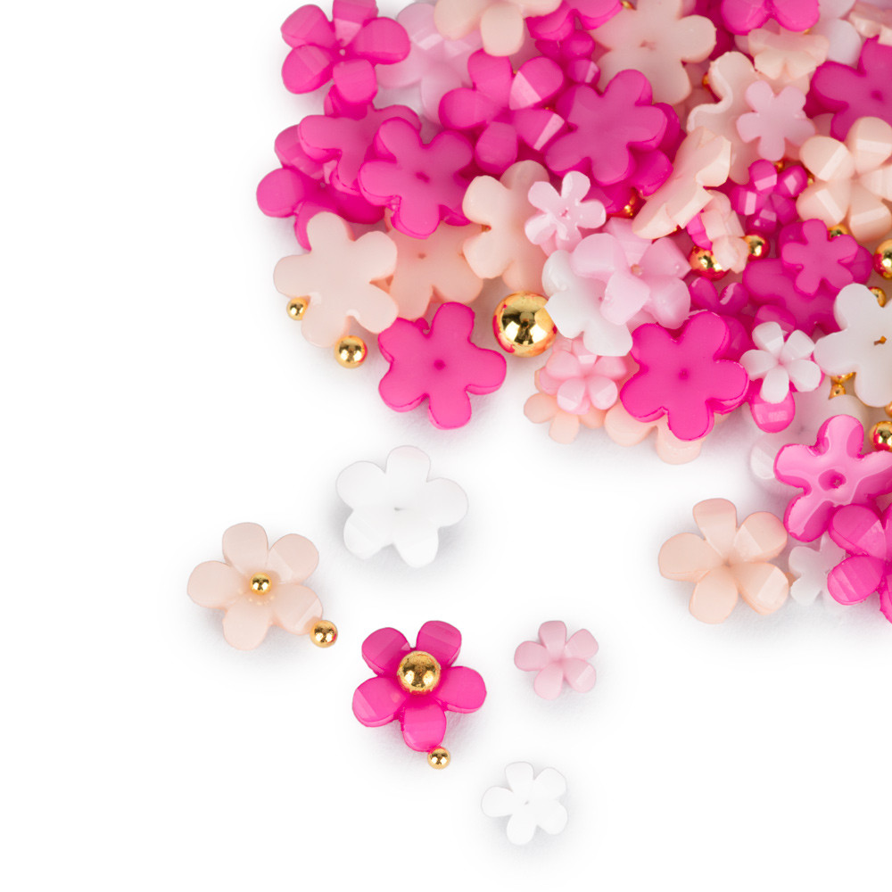 • Zestaw zawiera ok. 150 sztuk akrylowych kwiatków w mixie kolorów oraz złote kulki dekoracyjne.