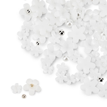 • Zestaw zawiera ok. 150 sztuk akrylowych kwiatków  białe +  kulki dekoracyjne.