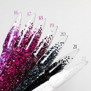 Drobiny można zatapiać pod warstwą żelu, akrylu lub bazie  – tworząc efekt delikatnych „piegi” lub pełnej, błyszczącej tafli. Każdy numer (1–21) to inna kombinacja kolorów i odcieni, dzięki czemu z łatwością dopasujesz ozdobę do swojego stylu.